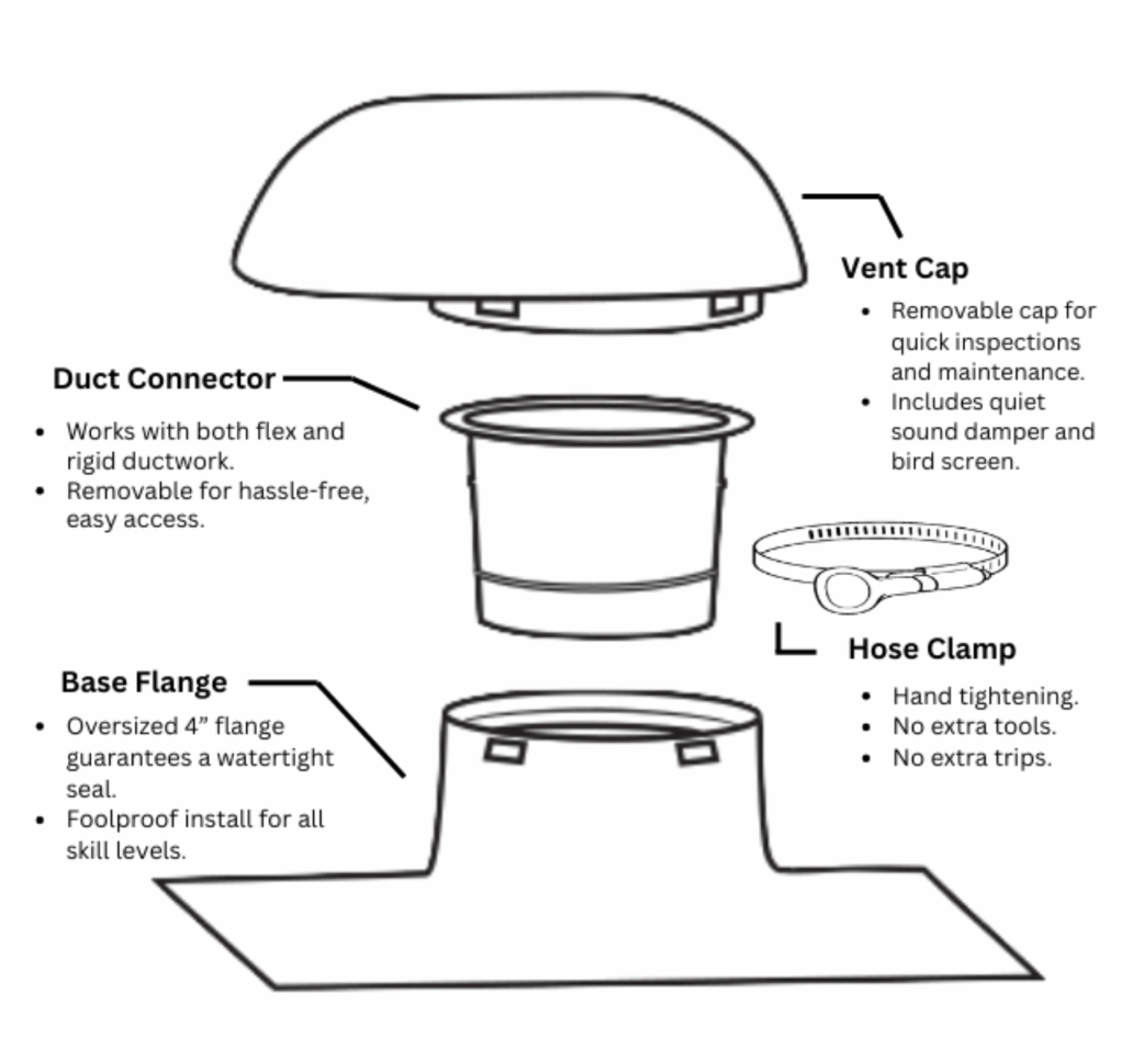 Eliminates callbacks caused by disconnected vent hoses resulting in leaks and moisture damage.